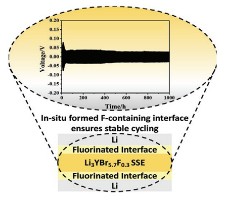 創(chuàng)新團隊以Li3YBr6(LYB)鹵化物固態(tài)電解質(zhì)為基體進行F摻雜,制備出了Li3YBr5.7F0.3固態(tài)電解質(zhì),該固態(tài)電解質(zhì)通過與金屬鋰原位生成高濃度氟化物界面鈍化層,顯著改善了鋰金屬負極在全固態(tài)電池的循環(huán)穩(wěn)定性,解決了鹵化物固態(tài)電解質(zhì)材料應(yīng)用于金屬鋰負極固態(tài)電池的關(guān)鍵技術(shù)瓶頸,為行業(yè)在高比能量全固態(tài)電池發(fā)展方面提供了新思路。